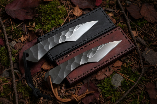 A handcrafted vegetable-tanned leather sheath completes the package — purpose-built storage for a purpose-built knife.