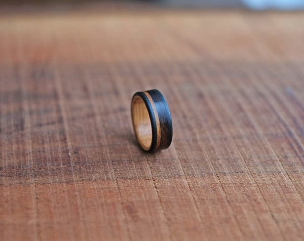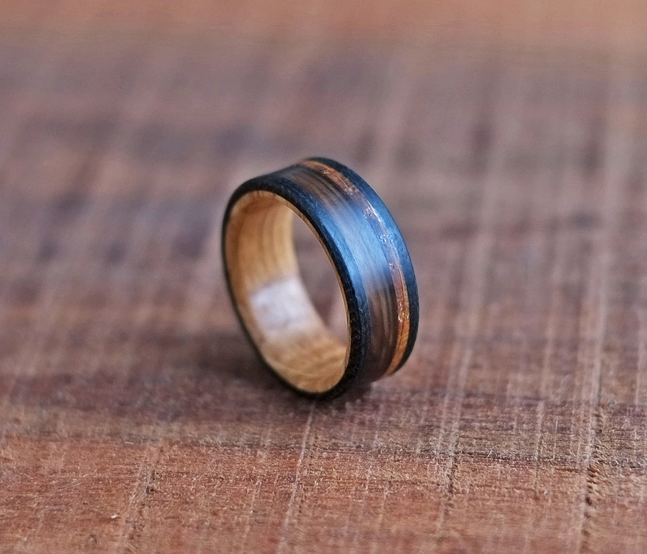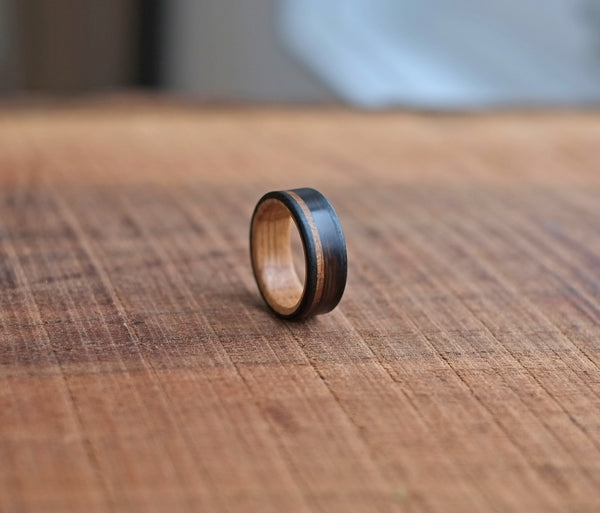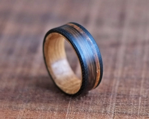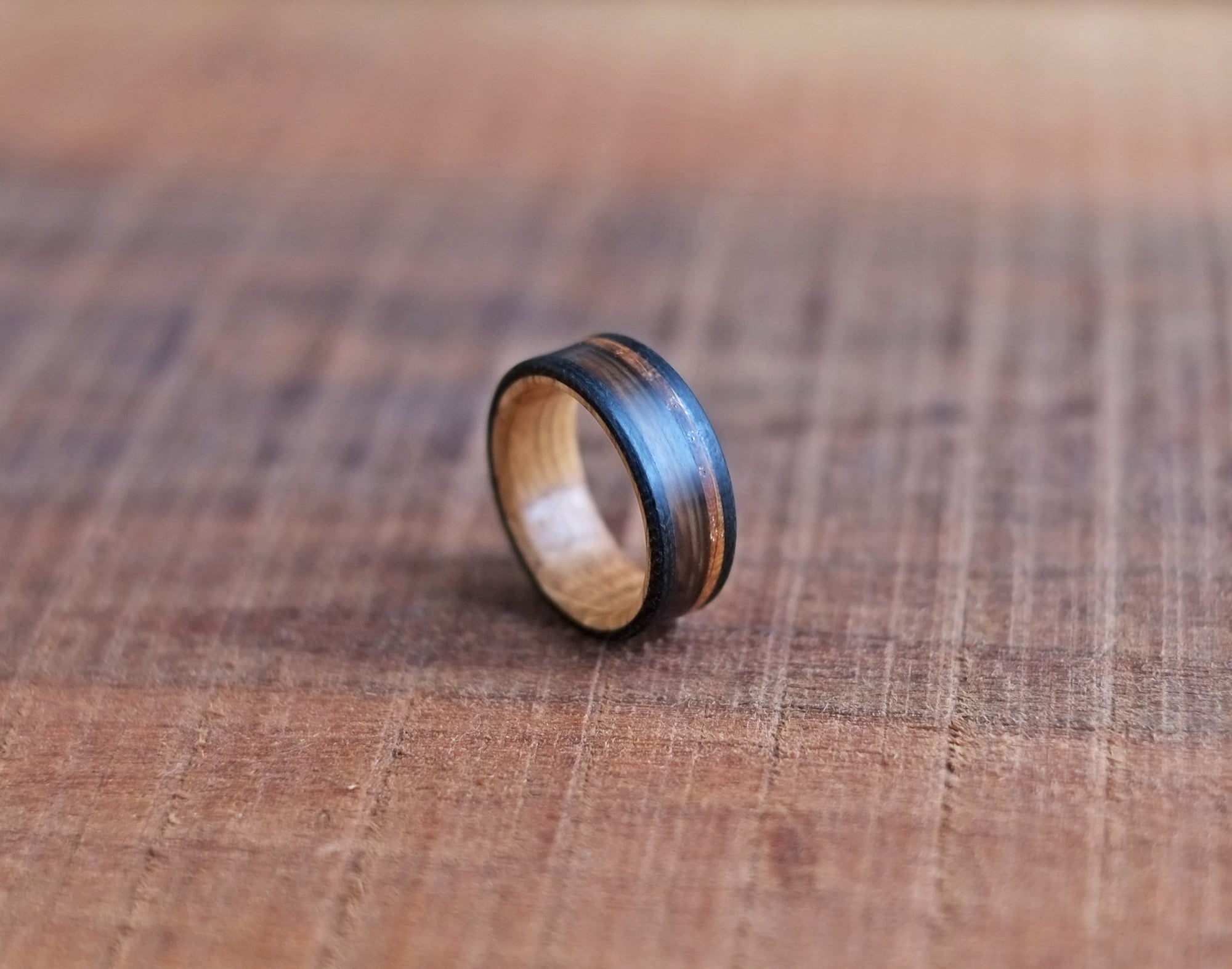 Built around a core of reclaimed whiskey barrel oak, The Manitoban exemplifies our rustic, non-traditional approach to wedding bands. The oak carries the quiet history of years spent aging spirits, bringing warmth, character, and a story into the ring itself.