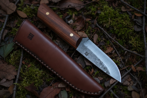 The Walnut Bushknife is forged from reclaimed century-old high carbon sawmill steel, hardened to 60HRC for a tough, lasting edge that handles everything from fine carving to heavy camp work. The 4" cutting edge is purpose-built for bushcraft and hunting tasks, while the spine tells the full story — slightly rounded where the thumb rests for all-day comfort, with a hard edge along the remainder for scraping, bark processing, or throwing a spark with a ferro rod.