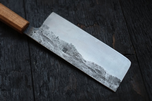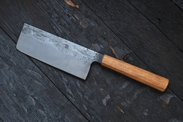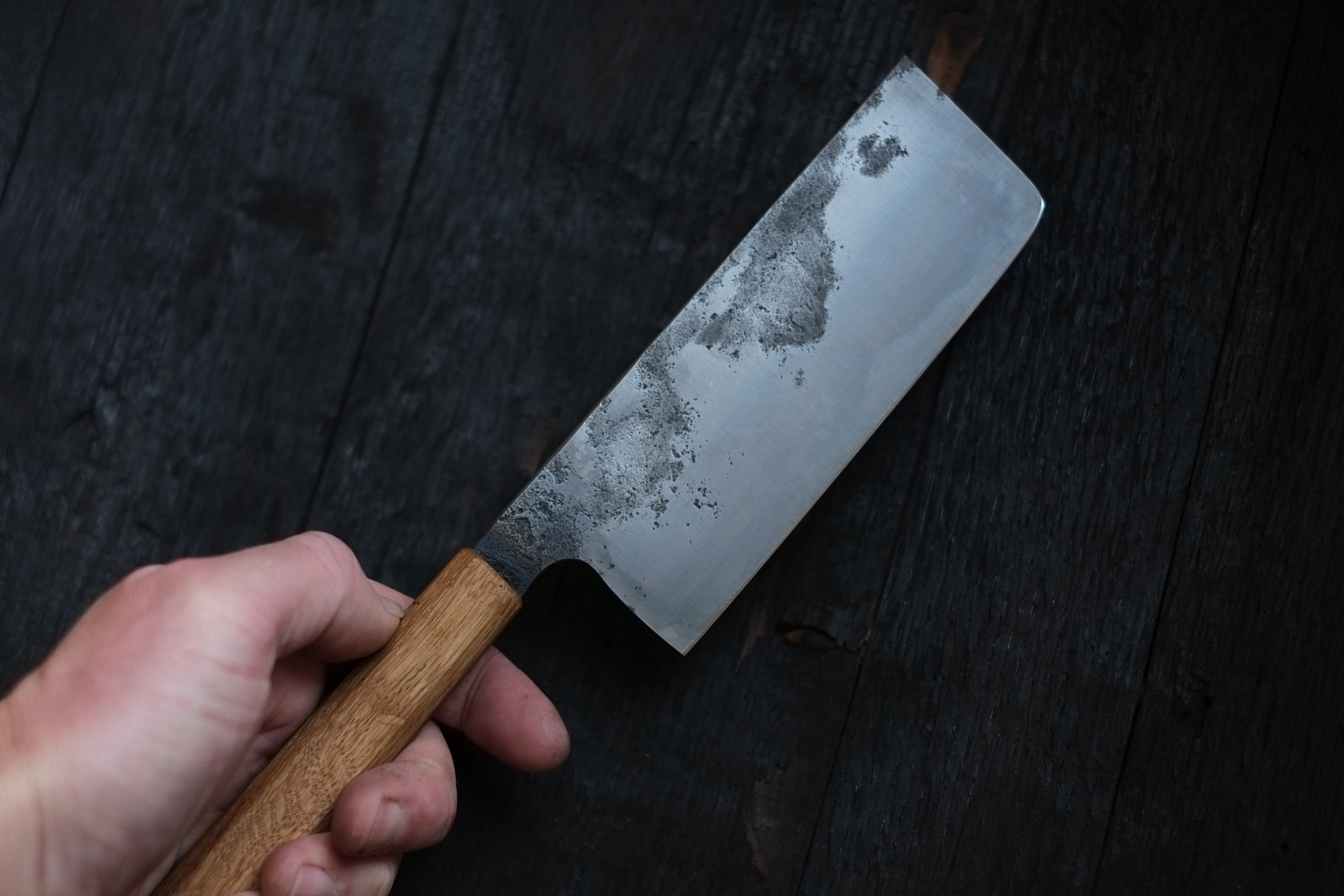 当社のブレードは高炭素鋼で作られています。この鋼はエッジの保持力と耐久性で知られています。ただし、ステンレス鋼とは異なり、これらのブレードは時間の経過とともに自然に酸化し、美しい緑青が生じます。