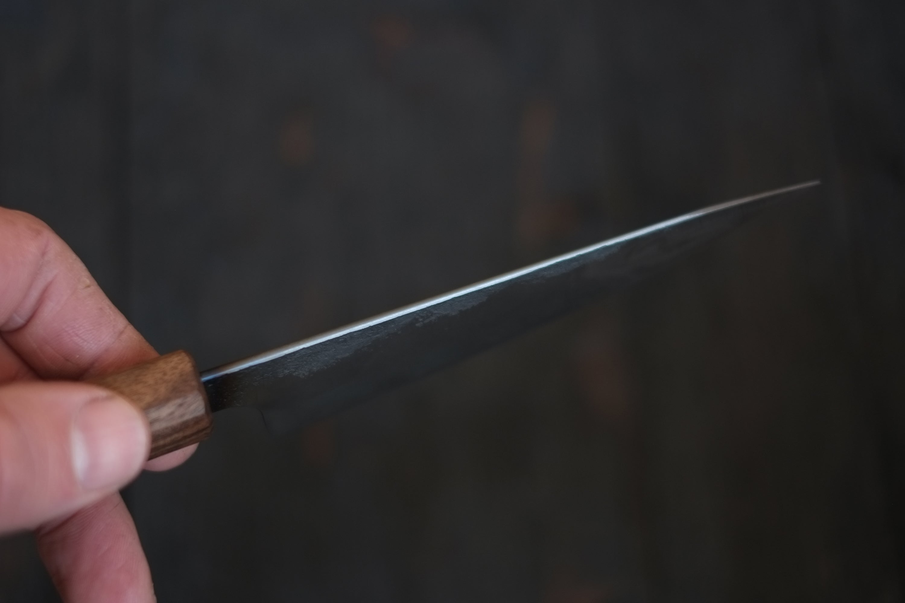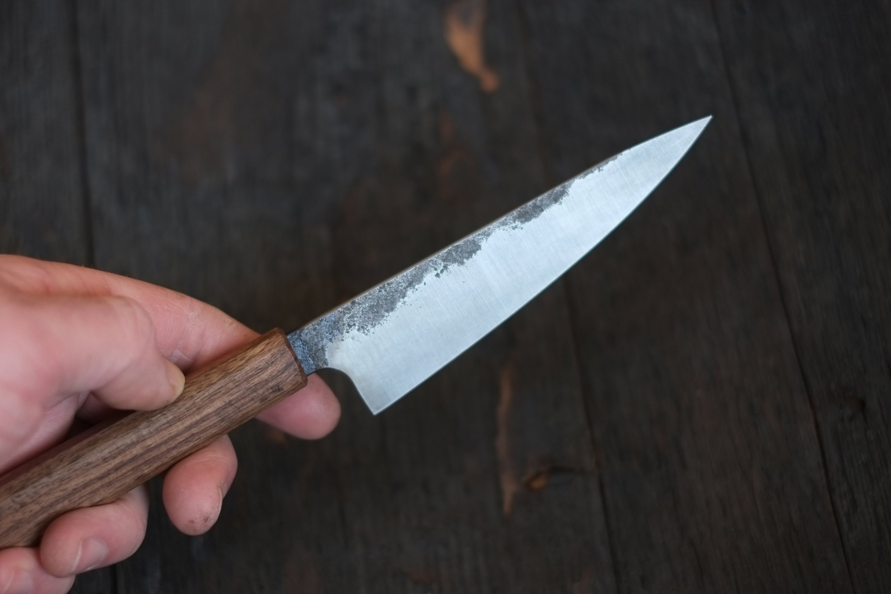 当社のブレードは高炭素鋼で作られています。この鋼はエッジの保持力と耐久性で知られています。ただし、ステンレス鋼とは異なり、これらのブレードは時間の経過とともに自然に酸化し、美しい緑青が生じます。