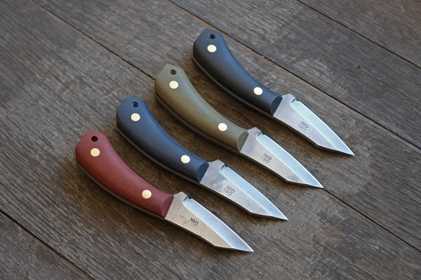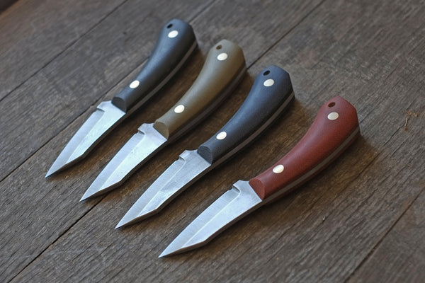 Here's a great example of a custom set of four "Oaken" TILIs we can make for a wedding party. They come with custom lettering on the leather sheaths and can be made with either wood, micarta or any other handle material you might have in mind.