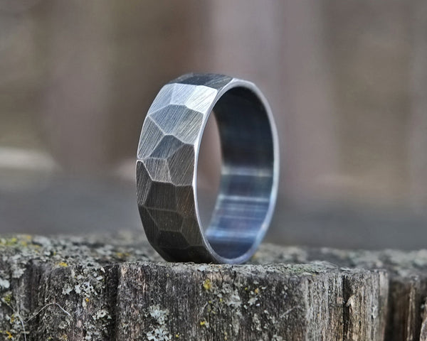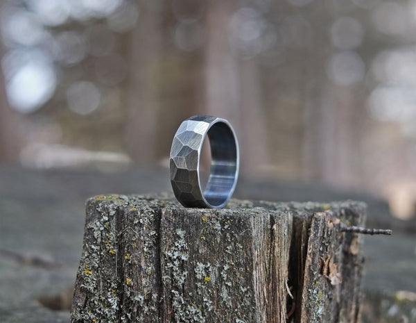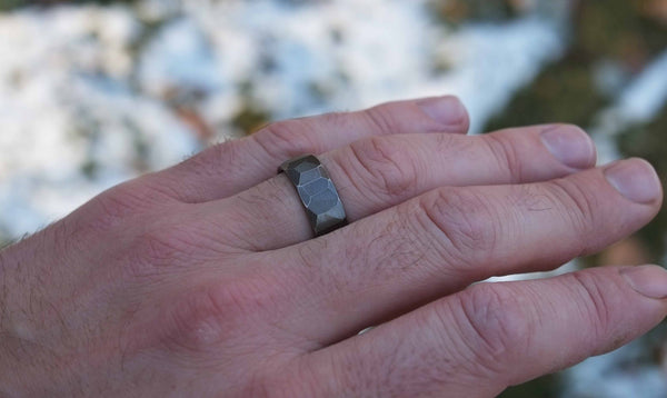 Turned and faceted by hand, the incredible texture of this stainless-steel ring practically jumps out at you. Light catches the intricate facets and showcases the depth and beauty of stainless steel that’s been worked by hand.